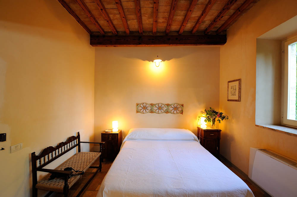 Cam. 8: (2 posti letto) (16 mq ca.) zona notte a una finestra arredata con letto matrimoniale in ferro battuto, due comodini, armadio a muro a quattro ante e tv, piccola cassapanca, bagno con finestra, doccia, water e bidet, lavabo con specchio e asciugacapelli;