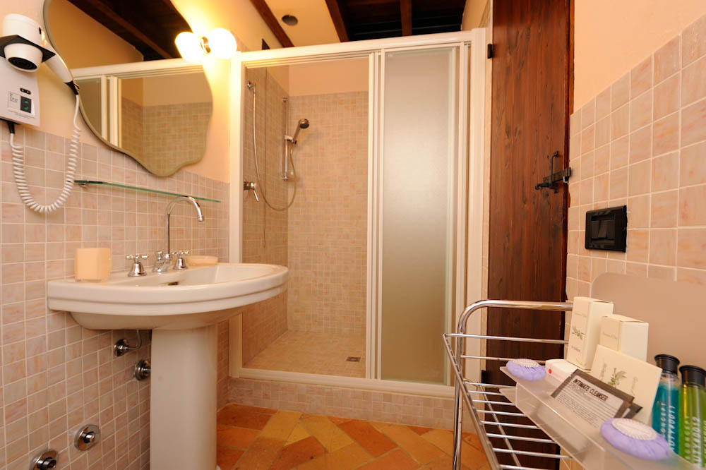 doccia, water e bidet, lavabo con specchio e asciugacapelli;
