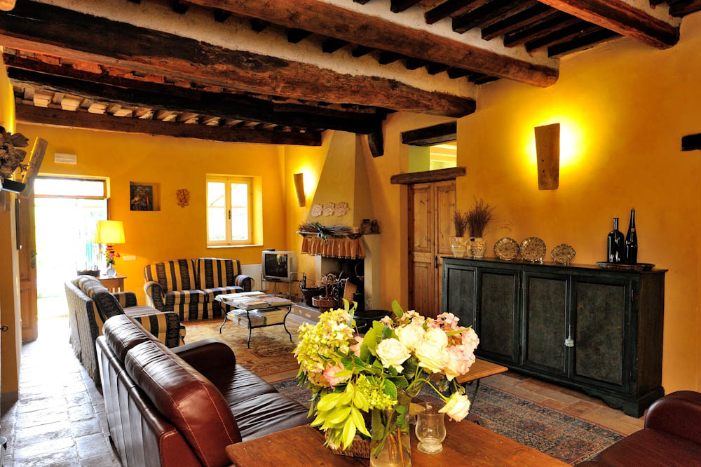 un salone centrale (50 mq ca.) con camino e soffitto a volta arredato con divani e mobili dell'epoca dal quale si accede alle 4 suites;