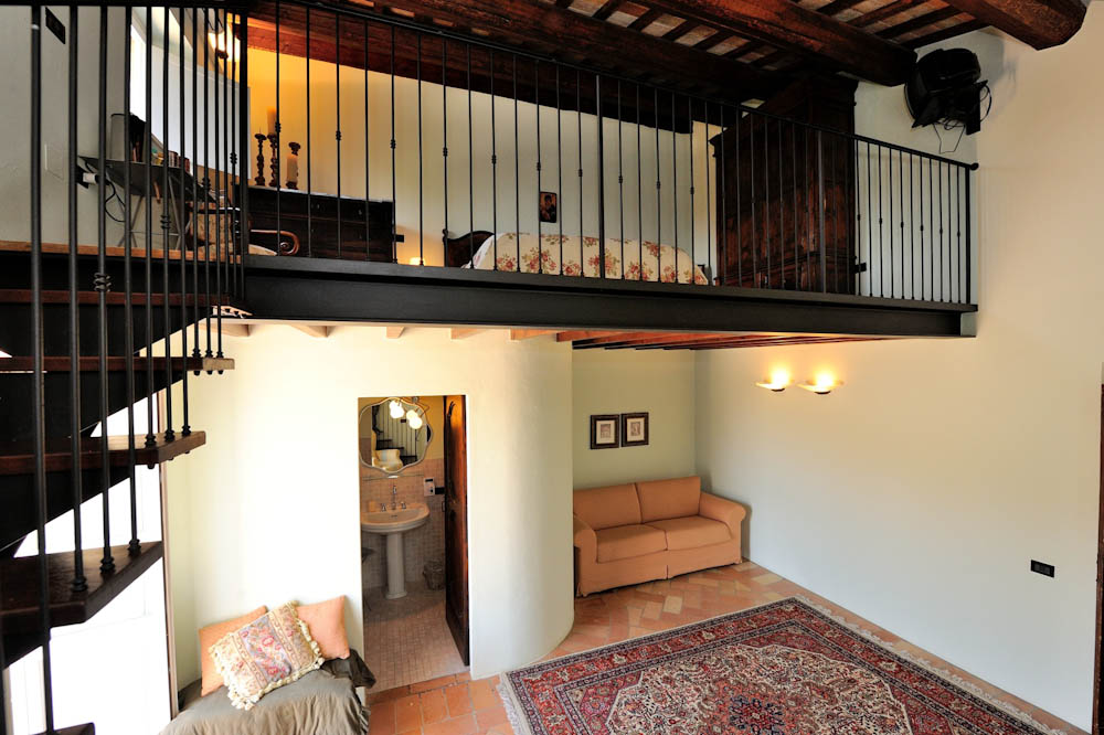 una suite (2+2 posti letto) (40 mq ca.) con zona notte con letto matrimoniale o due singoli, servizi e una scala in legno e ferro battuto che porta alla zona soppalco dove si trova il salotto con sofa (che si trasforma