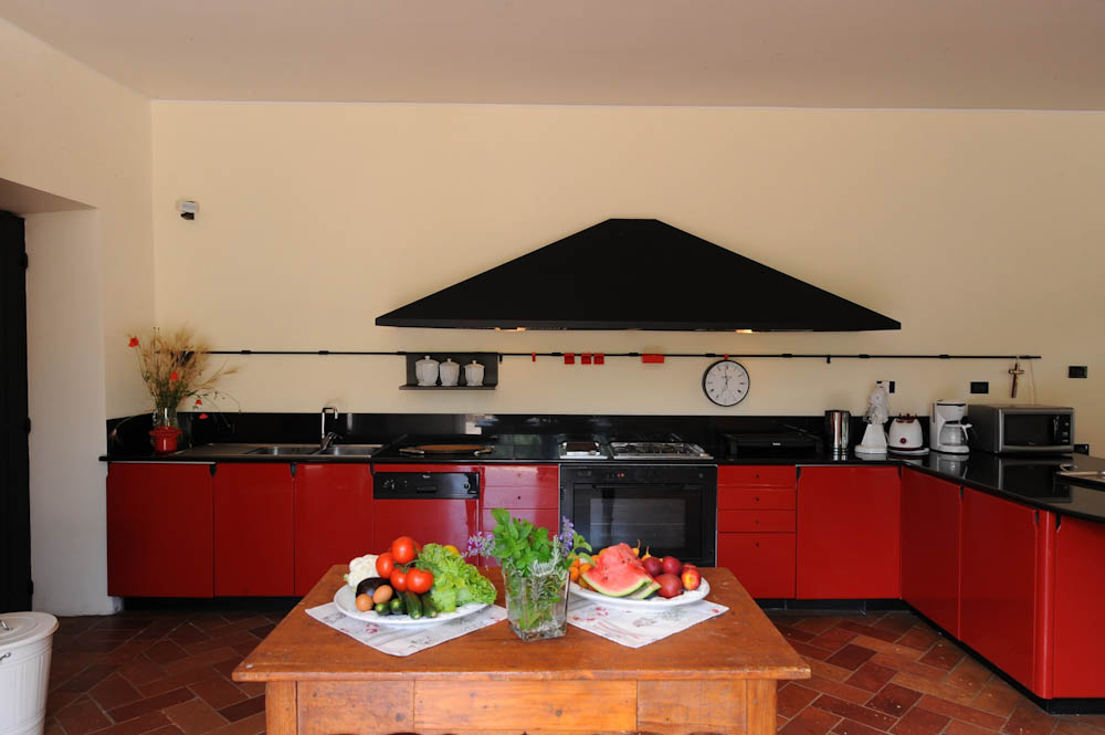 una cucina (25 mq ca.) che si apre con una porta sul giardino dal quale si accede alla piscina. La cucina è dotata di frigorifero, frezeer, forno elettrico, fornelli, forno microonde, bollitore, caffettiere, stoviglie, tegami,