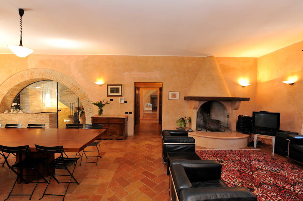 un salone (60 mq ca.) con camino centrale arredato con divani e tavoli, perfetto per cene e feste;