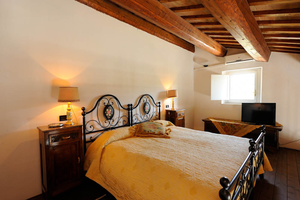 Cam. 8: (2 posti letto) (16 mq ca.) zona notte a una finestra arredata con letto matrimoniale in ferro battuto, due comodini, armadio a muro a quattro ante e tv, piccola cassapanca, bagno con finestra, doccia, water e