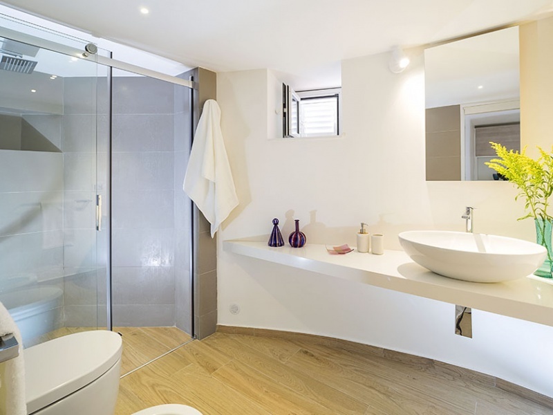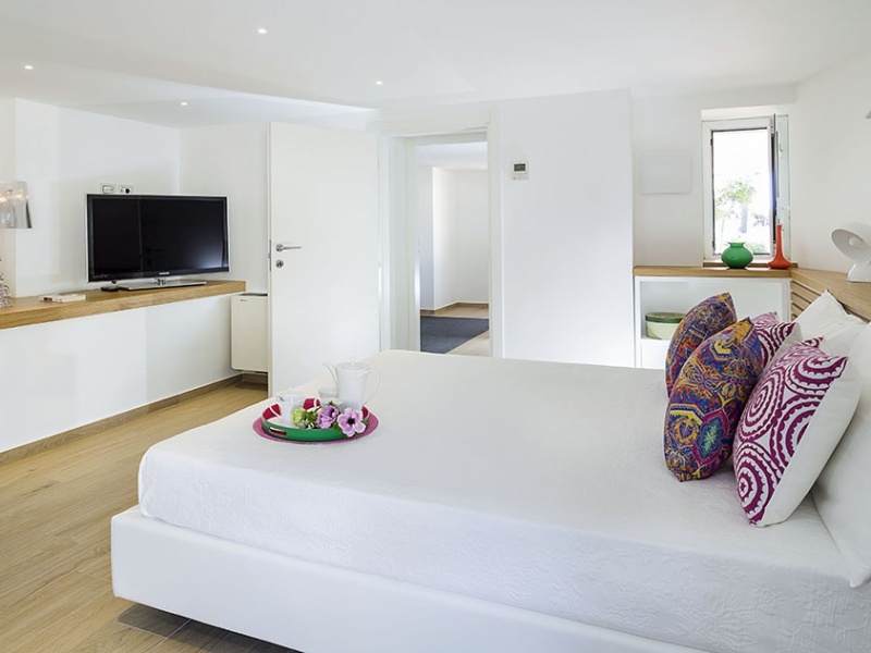 Gli accoglienti ambienti interni della villa sono distribuiti in due corpi di fabbrica che si affacciano sulla grande piscina. Arredati in stile contemporaneo, dispongono di 9 camere da letto climatizzate, di 8 lussuosi bagni, 2 cucine, 2 soggiorni e un salone, che consentono di ospitare comodamente fino a 18 persone.