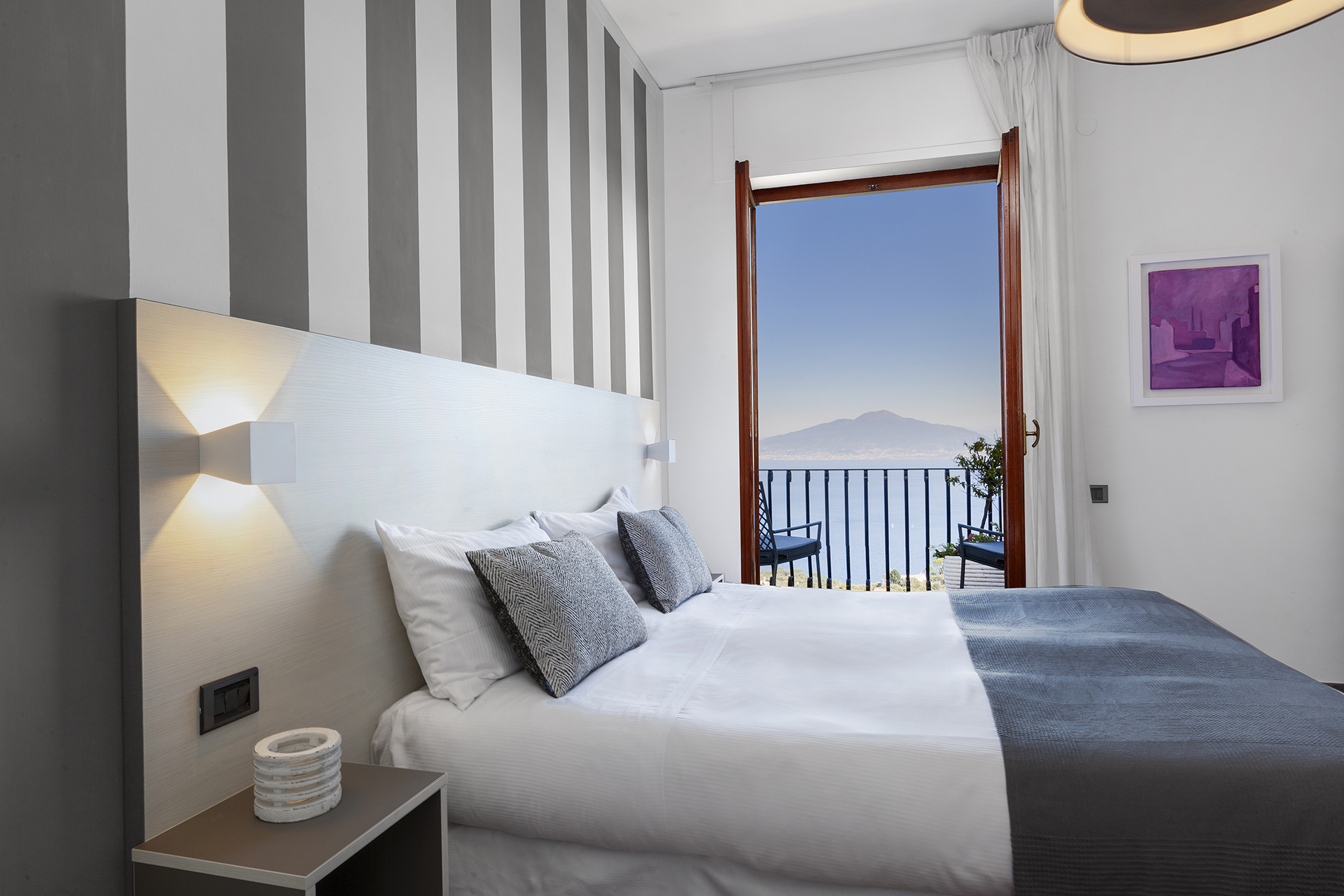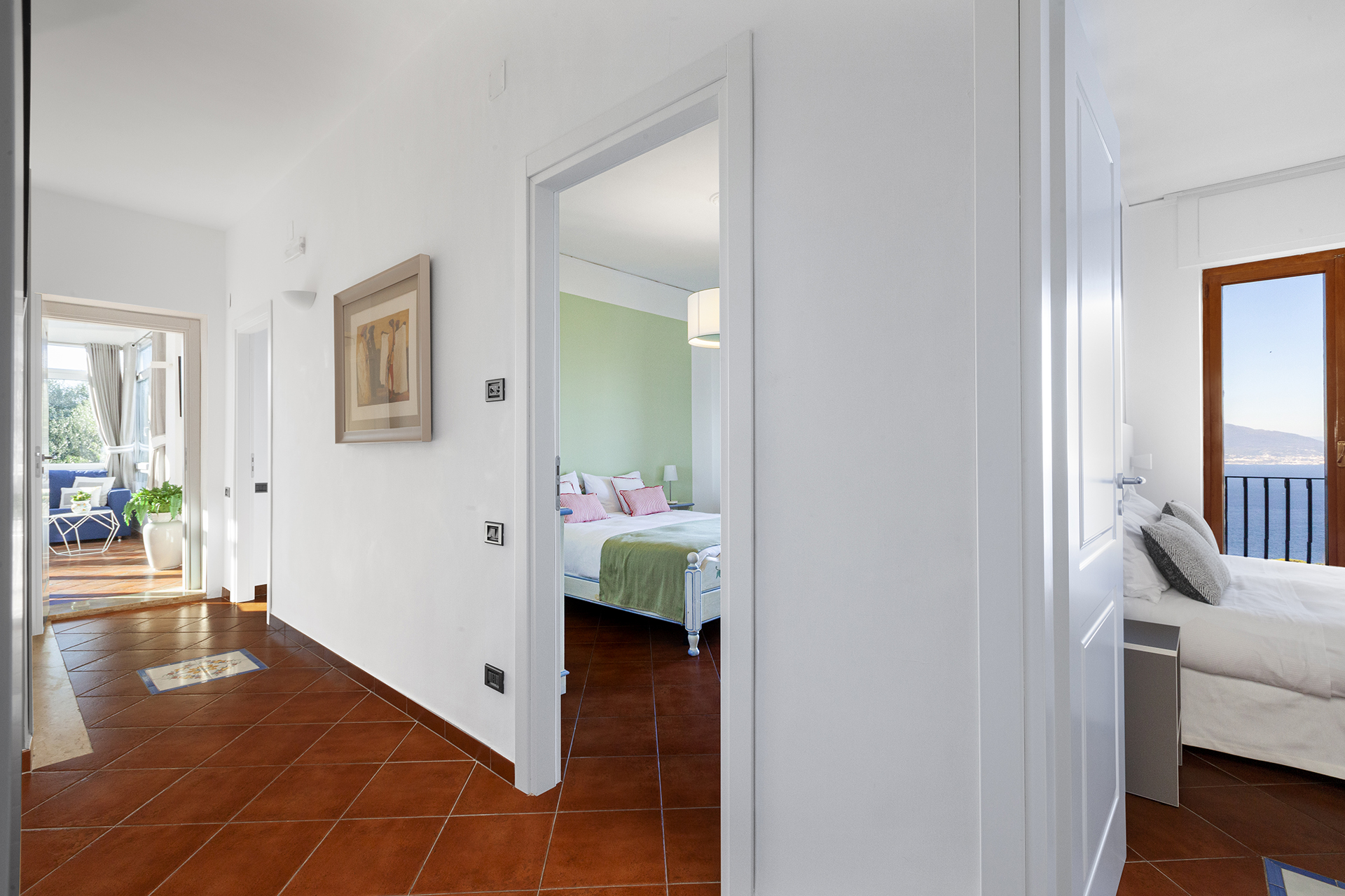 LA PRIMA CAMERA DA LETTO ha un letto matrimoniale, l’armadio e la scrivania. Vi si accede dal corridoio. È dotata di aria condizionata/riscaldamento. Da qui, tramite una finestra alla francese potrete accedere ad un balcone (in comune con le altre camere da letto) da dove potrete ammirare la vista sul mare, su Sorrento e su Vesuvio.