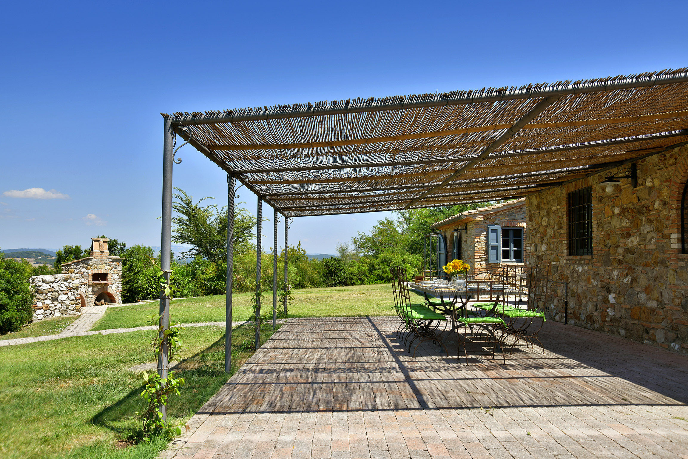 Ci sono due distinti parcheggi privati, due zone pranzo esterne con un grande tavolo, un comodo BBQ in pietra, la piscina a “sfioro” ed il giardino che circonda l’intera casa.