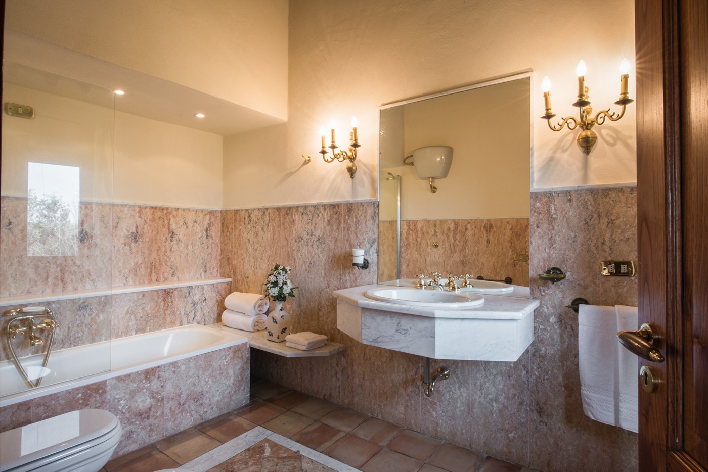 Edificio principale da 14 posti letto al piano terra grande corte interna con possibilità di mangiare all’esterno, una sala da pranzo, un grande salone con caminetto con tavolo da biliardo, lettore cd, una sala con tv sat, una grande cucina perfettamente attrezzata con caminetto, forno, un frigo dispensatore di ghiaccio, congelatore e lavastoviglie, un servizio, una cantina posta al piano interrato. Al primo piano grande sala con caminetto, computer, stampate e fax , una camera matrimoniale con bagno interno con vasca, una camera matrimoniale con bagno interno con doccia e bagno turco, una grande suite matrimoniale con studio, spogliatoio e bagno interno con vasca idromassaggio, una camera matrimoniale, un bagno con vasca, una camera matrimoniale, due camere matrimoniali con bagno interno con vasca (in comune alle due camere), una sala d’inverno con camino.