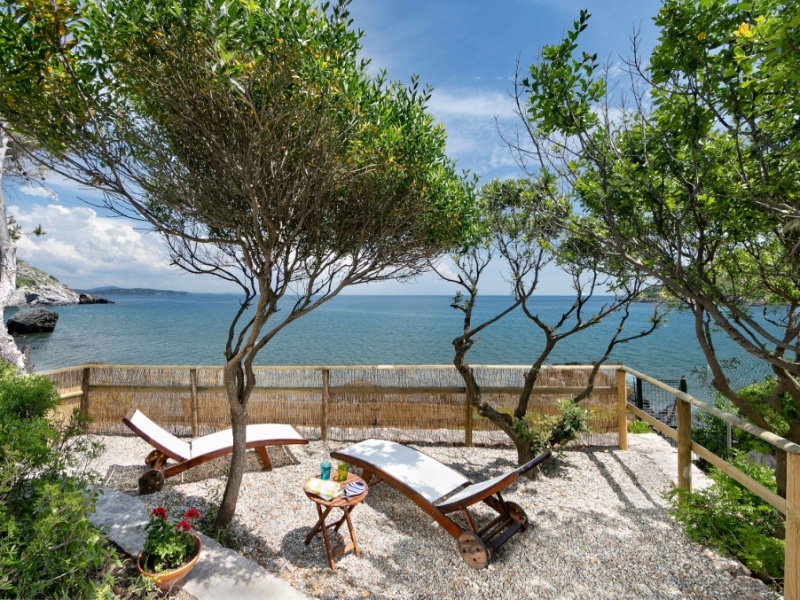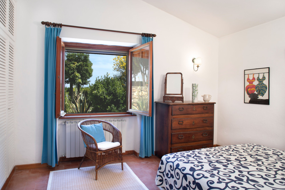 Giardino recintato su vari livelli con pini, lecci, rosmarini, oleandri e agavi, due scale di pietra ai due lati opposti della proprietà permettono di accedere comodamente alla spiaggia sottostante, ampie terrazze sui lati est e nord della casa, lavatrice, tv sat, cassaforte, barbecue, garage per due automobili e parcheggio supplementare esterno. La vista dal giardino e dalla terrazza est abbraccia il forte La Rocca, la spiaggia della Feniglia, il promontorio di Ansedonia, l’isolotto e la punta Avoltore.