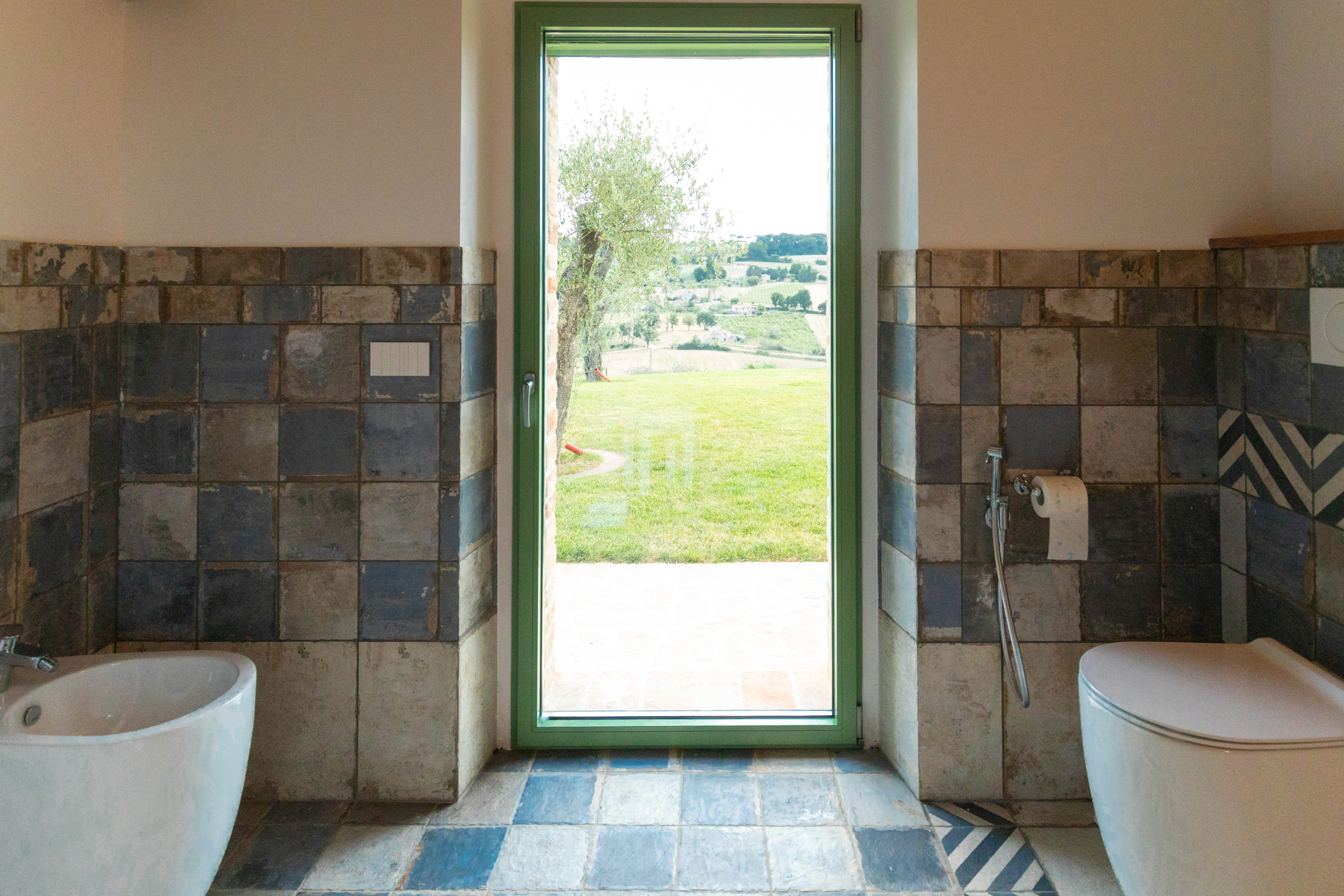 Le particolari finestre che lo circondano creano la sensazione di essere immersi nel verde pur stando nella piscina idromassaggio.