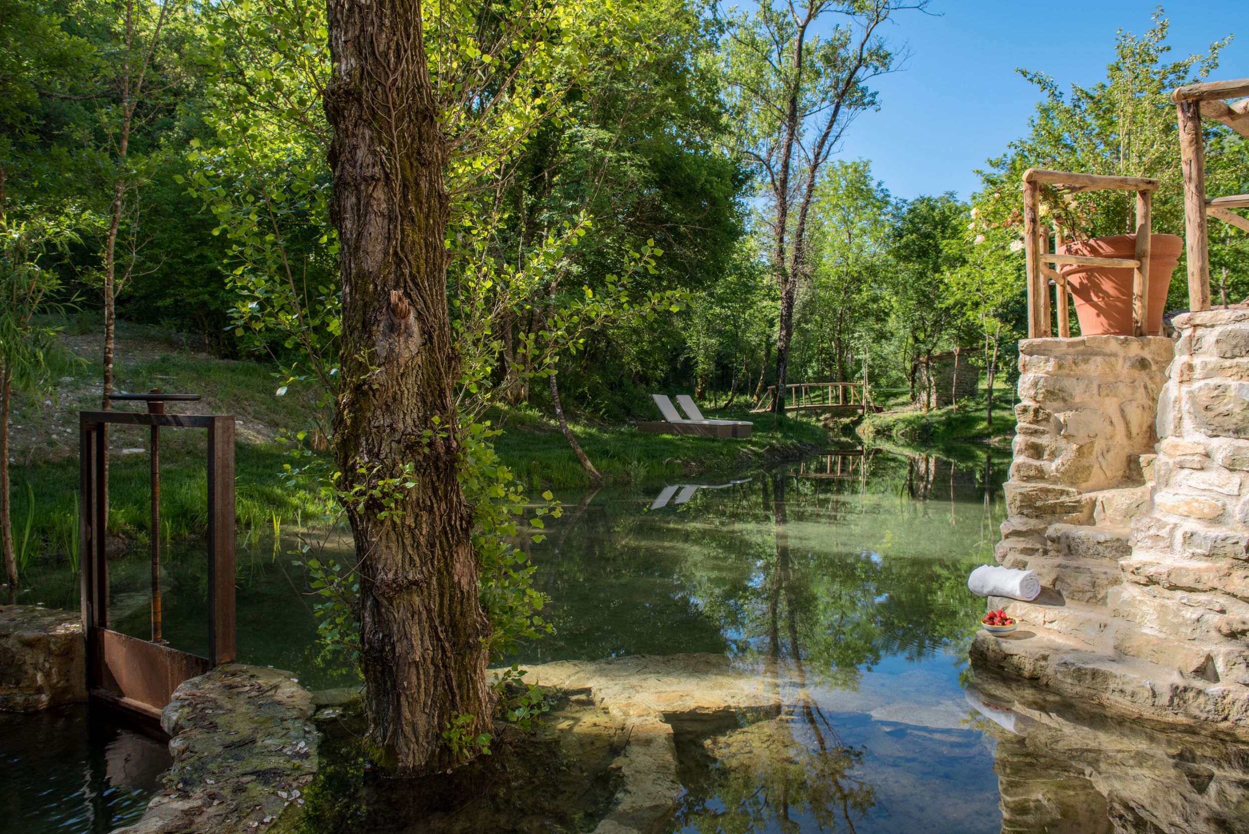 6 lettini in riva al ruscello e sulla terrazza intorno alla piscina