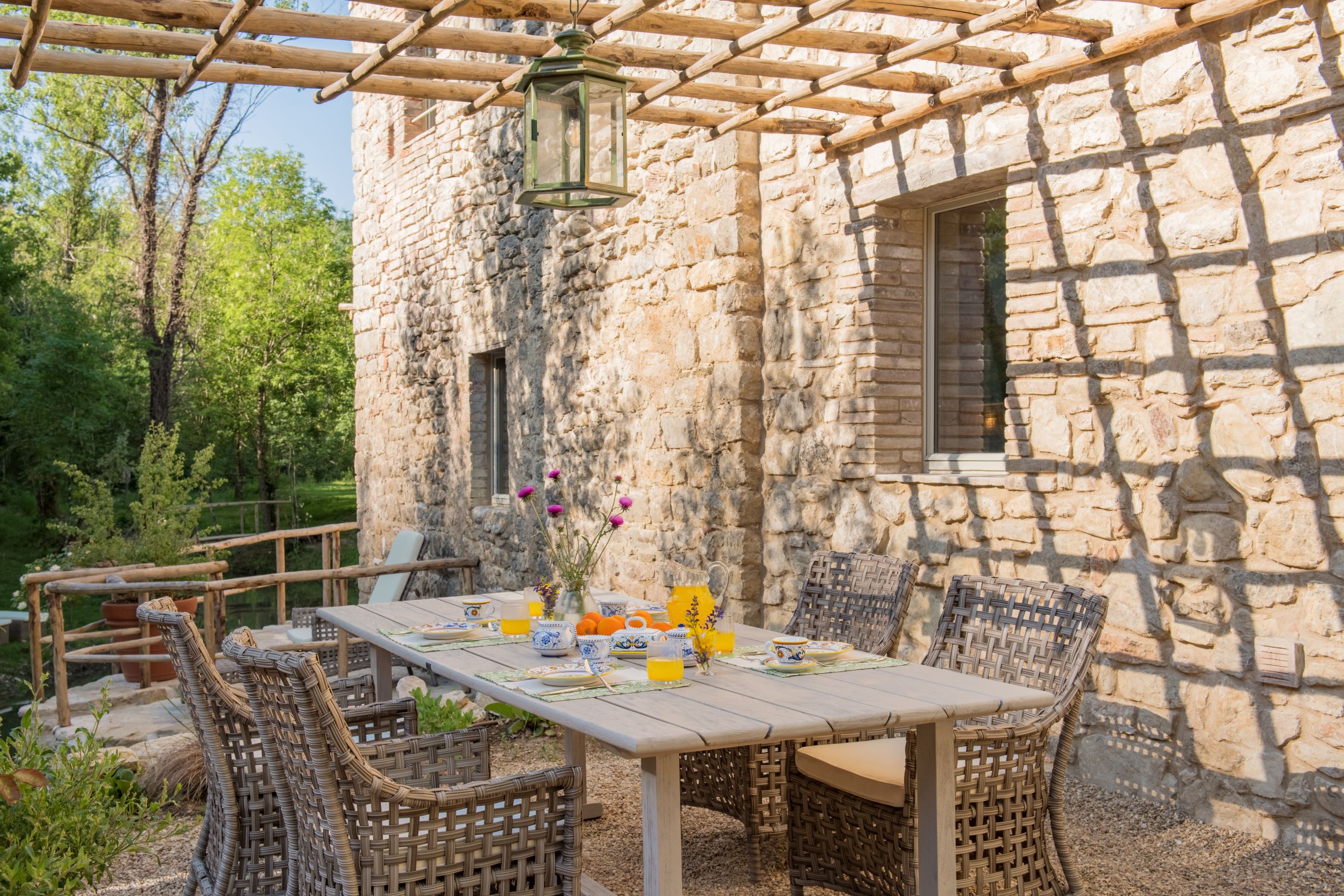 Spettacolare terrazza con pergolato, tavolo e sedie per quattro persone davanti alla sala da pranzo, vicino al ruscello.