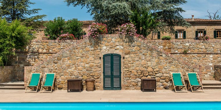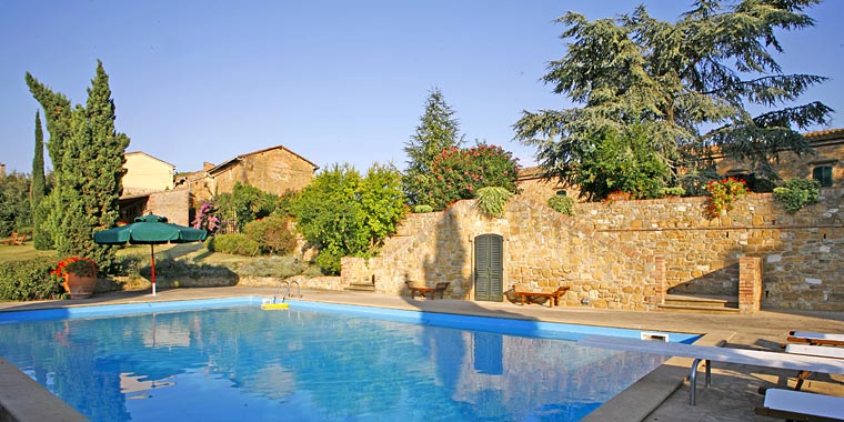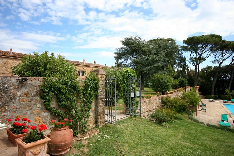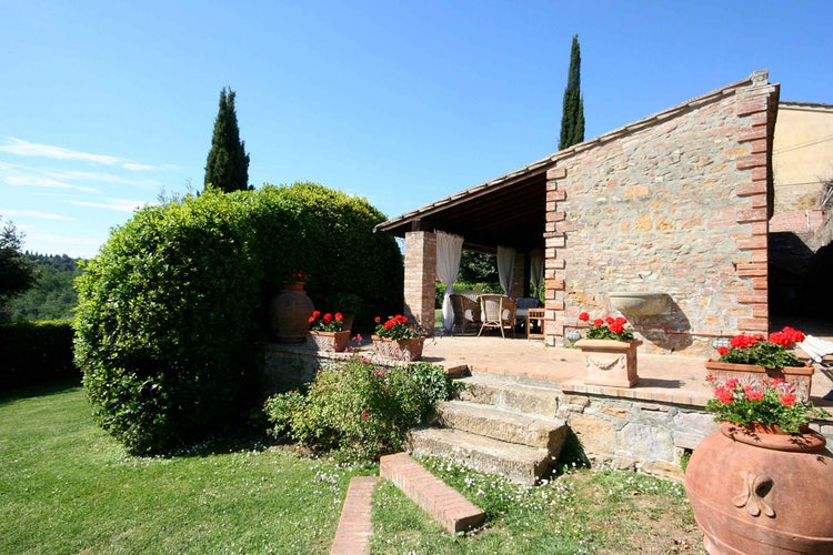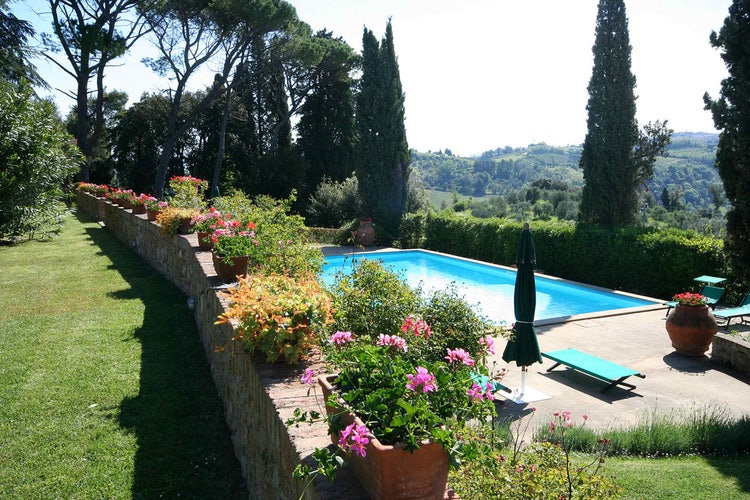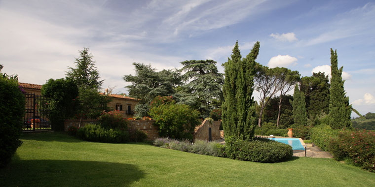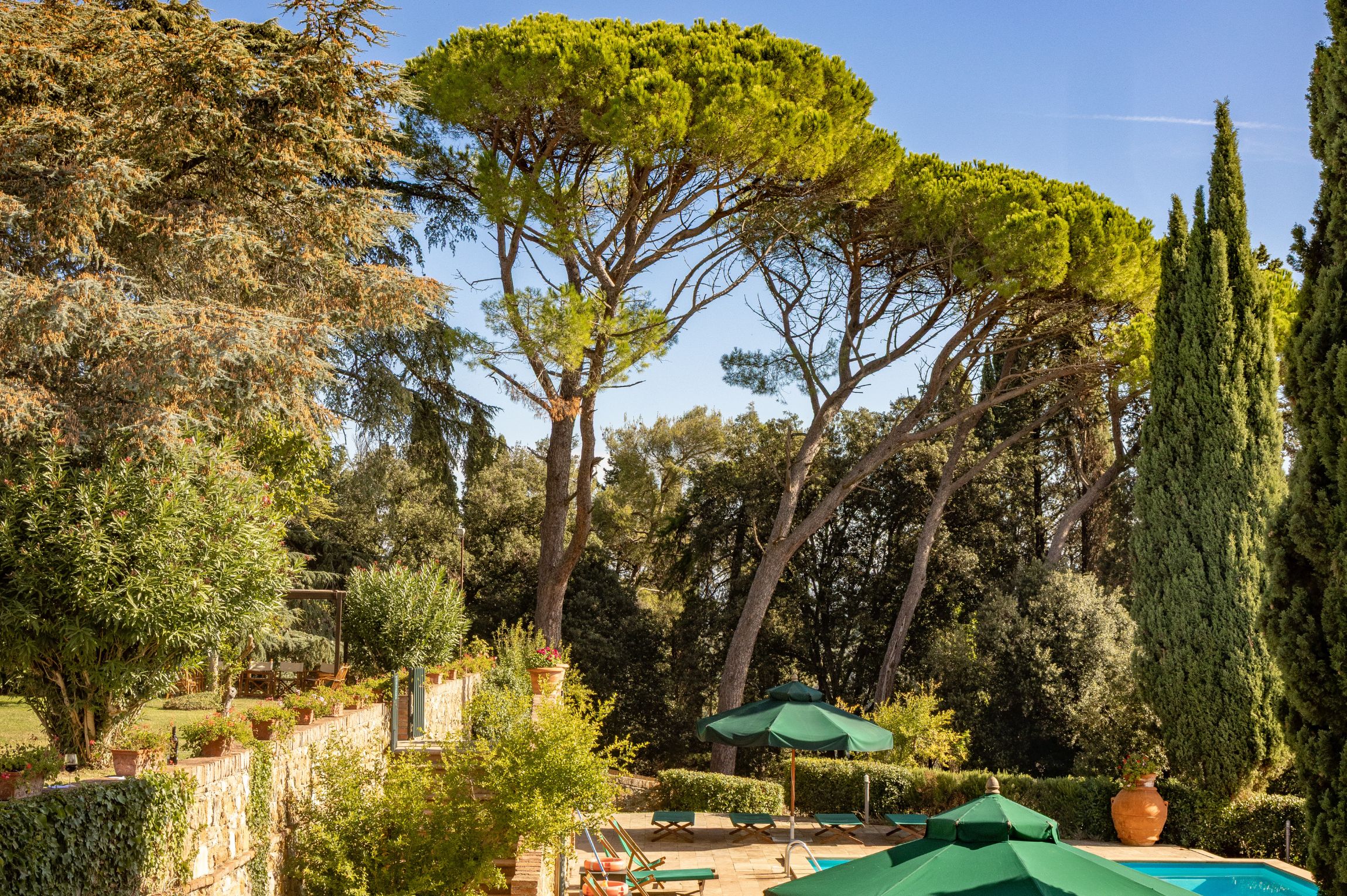 Di fronte alla villa un ampio giardino dal quale si gode un panorama mozzafiato sulla campagna toscana. Una scala in pietra a doppia rampa conduce alla piscina di metri 9X14, circondata da un grande prato sul caratteristico loggiato, dove è possibile mangiare e rilassarsi. Sul retro del loggiato un bagno con una grande doccia e spogliatoio.