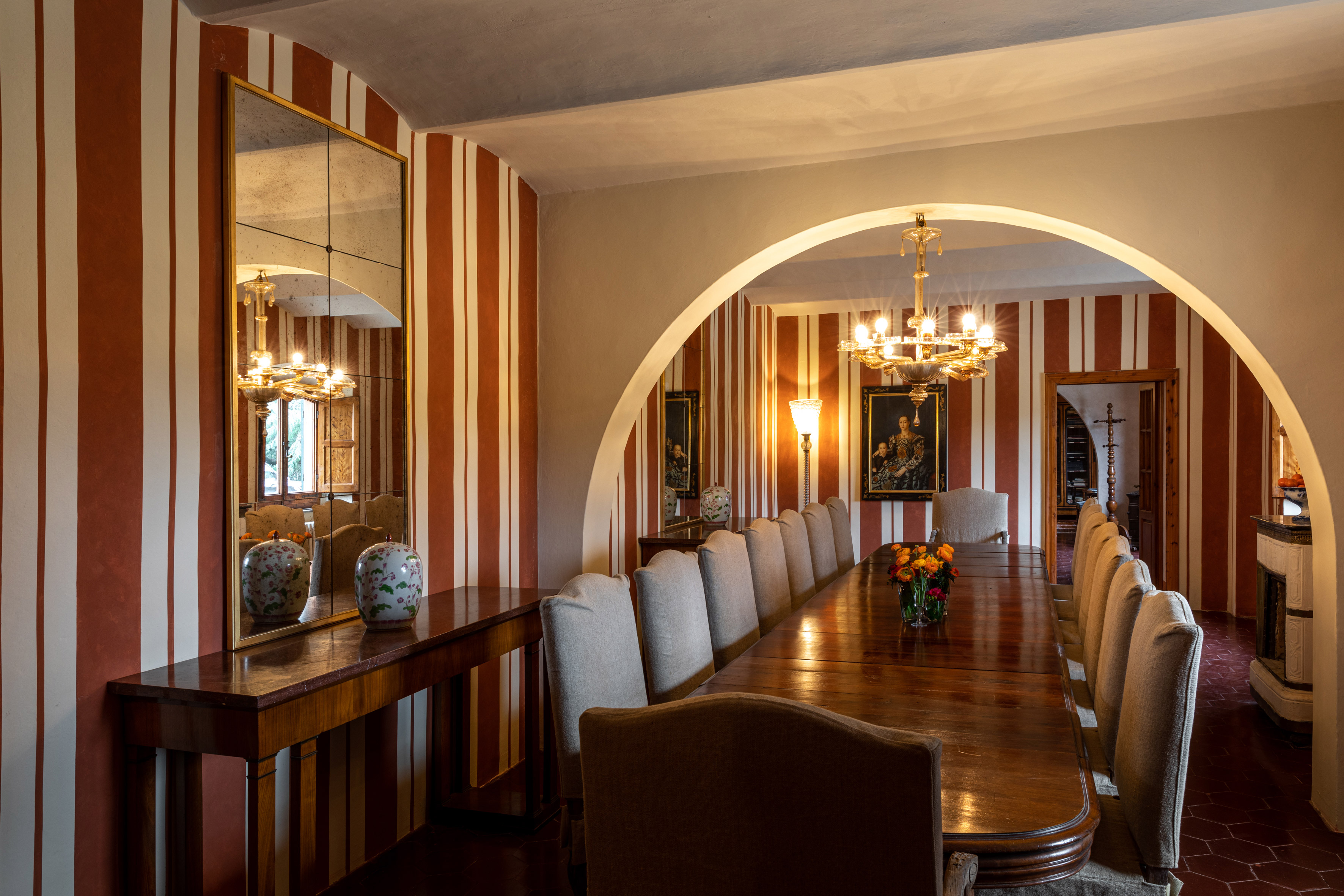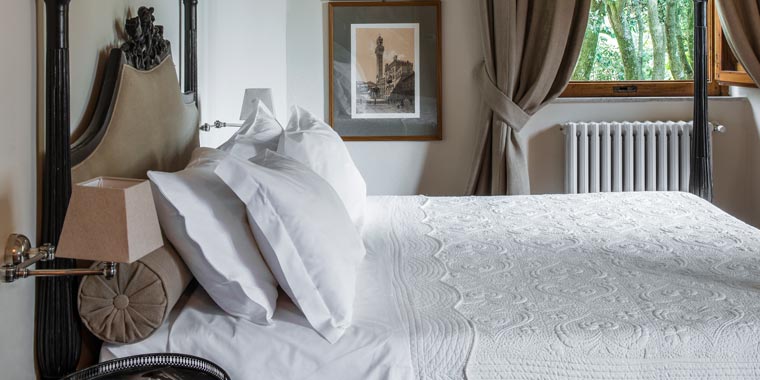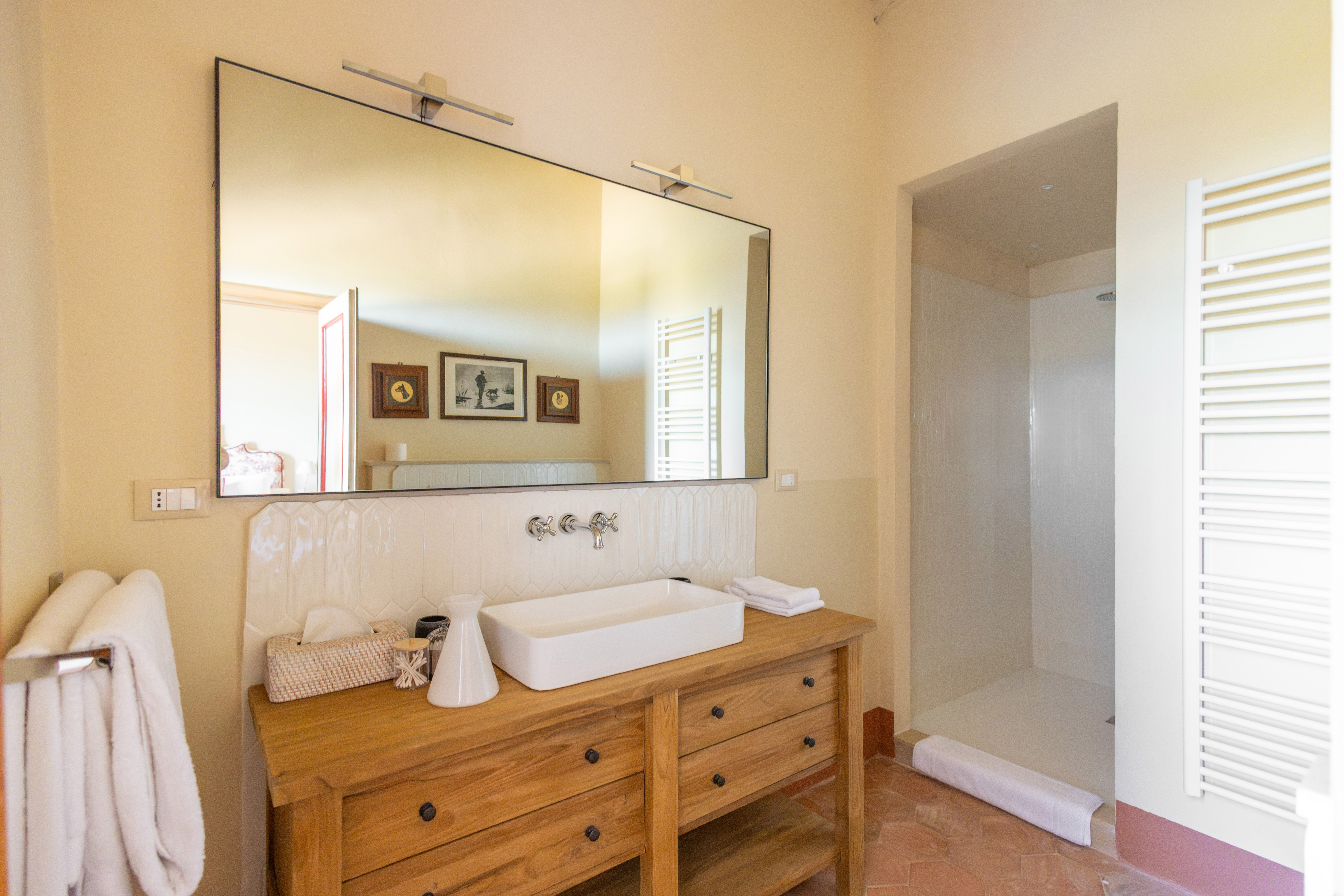 Una grande scala in pietra serena conduce al primo piano, dove si trovano 8 delle camere della Villa. Tutte le camere da letto hanno una magnifica vista sul giardino e vi si accede da un lungo corridoio che, verso sinistra, conduce alla master-bedroom con il grande letto a baldacchino – king size – che dispone di un salotto con una terrazza sul giardino e di un grande ed accogliente bagno in travertino. Sul medesimo lato, 2 camere matrimoniali con bagno en suite, una camera a due letti con bagno in marmo e l’unica camera singola in stile impero con letto alla francese ed un meraviglioso ed ampio bagno con un enorme doccia. A destra del corridoio, le due meravigliose suite entrambe a due letti con ampi bagni en suite di cui uno con vasca. Infine la camera dei nonni con il grande letto a baldacchino ed una vista mozzafiato sulla campagna Toscana. Nell’ala di destra della Villa troviamo altre due stanze da letto anch’esse con aria condizionata. La camera della tata con bagno privato si trova al piano terra in prossimità della cucina, mentre al primo piano l’ultima delle suite con letto a baldacchino e un magnifico bagno realizzato in mosaico con un pregiato marmo della zona.