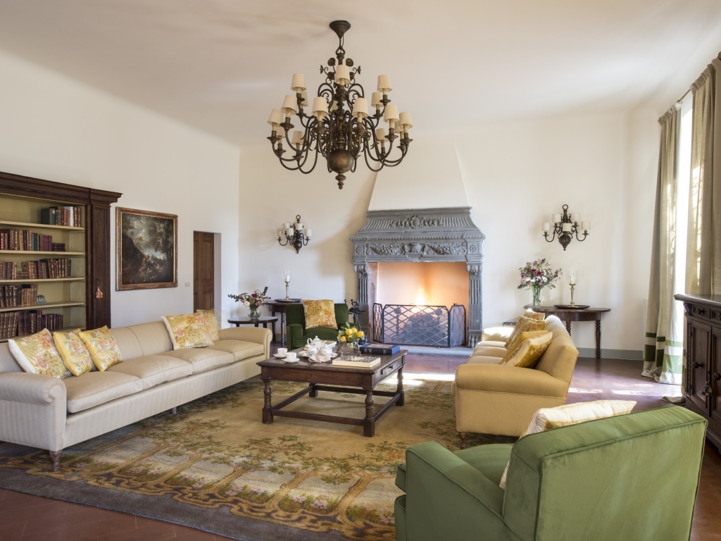 Piano terra principale della Villa: Doppio ingresso molto spazioso, inondato di luce naturale, una sala lettura accogliente ed elegante con un camino in pietra, un comodo salotto con TV, una grande sala da pranzo, un magnifico soggiorno con tre porte che danno accesso ad una terrazza panoramica, una cucina completamente attrezzata, una sala per la colazione con camino.