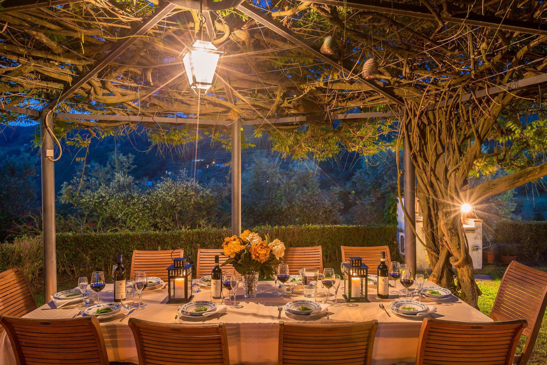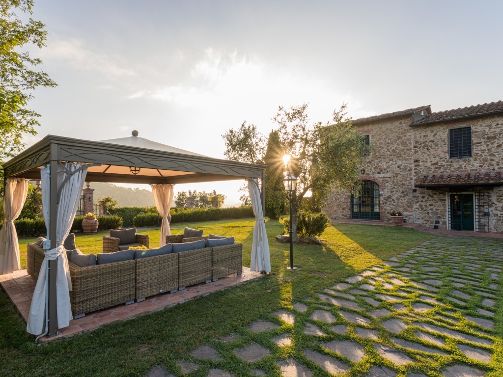 Area lounge in giardino con ampi e comodi divani e poltrone e tavoli in rattan, con copertura ecc.