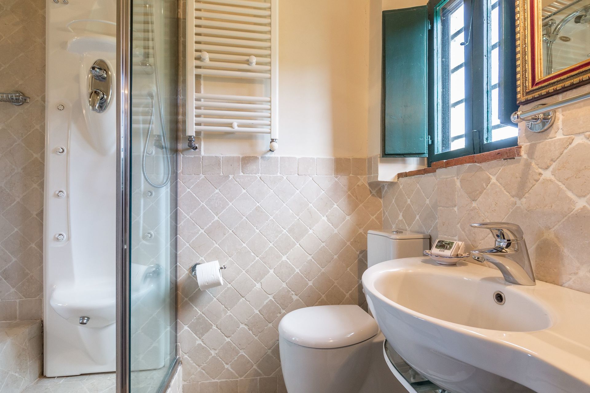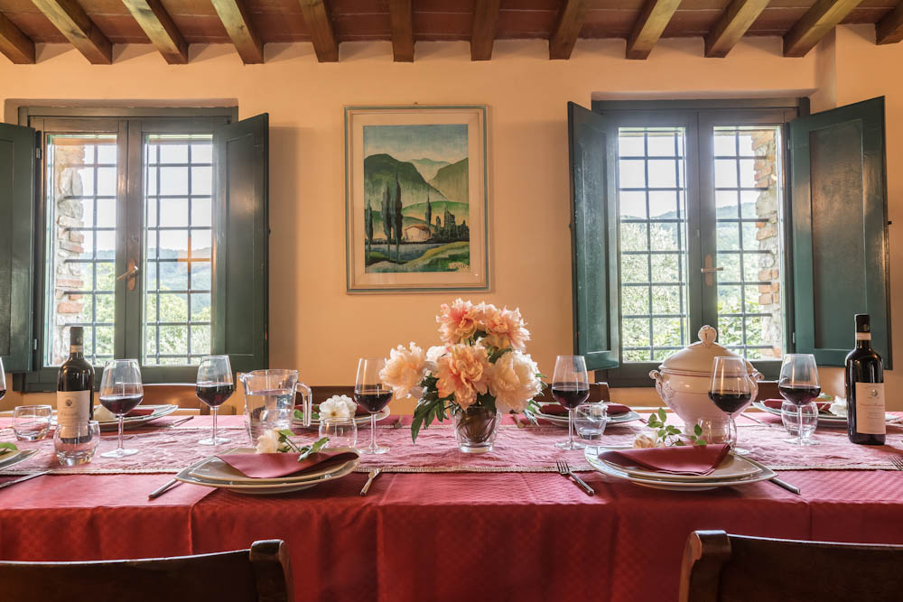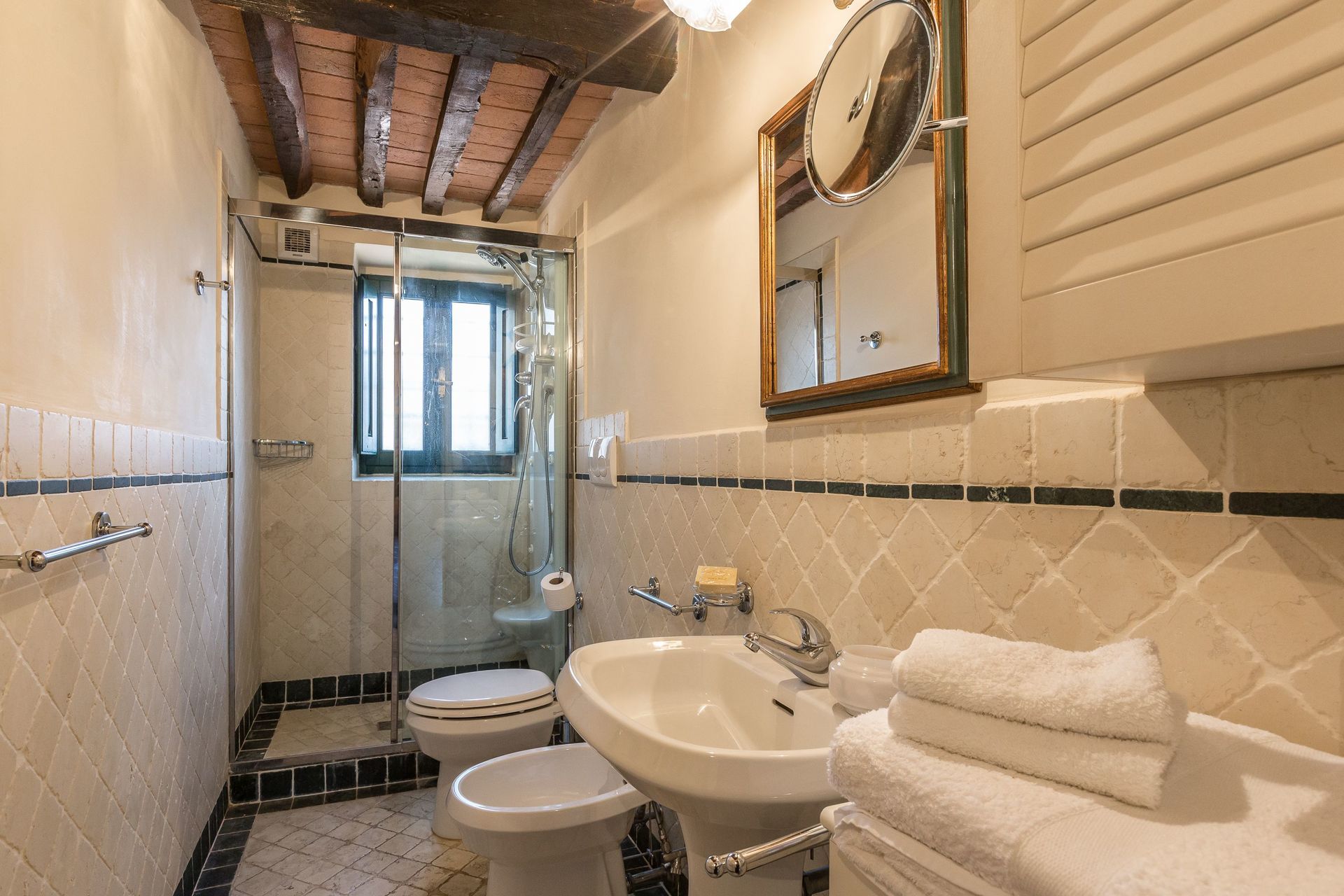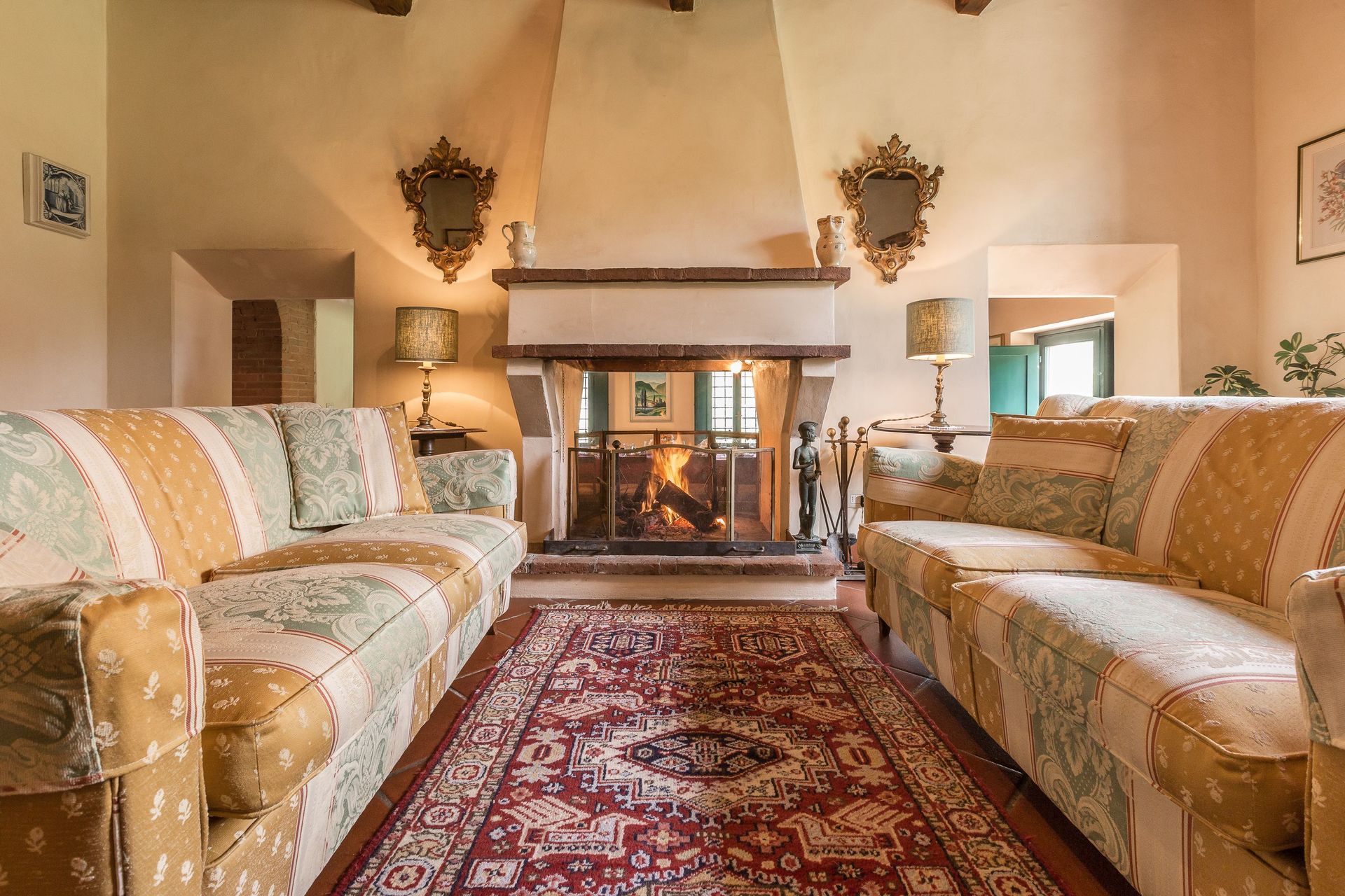 Al piano terra salotto/pranzo, sala con antico camino, tavolo da gioco e divano letto matrimoniale, cucina con forno, frigorifero e lavastoviglie, bagno con doccia idromassaggio jacuzzi, un ulteriore cucina con camino, forno e frigorifero con macchina per il ghiaccio, salotto con camino, sala pranzo con camino, sala tv con divano letto matrimoniale, sala biliardo, bagno con doccia idromassaggio jacuzzi, lavanderia con lavatrice e asciugatrice. Al piano mezzanino una camera con due letti singoli che usufruisce del bagno a piano terra. Al primo piano una camera matrimoniale con bagno con vasca e doccia idromassaggio jacuzzi, due camere matrimoniali con bagno con doccia idromassaggio jacuzzi, una camera matrimoniale con soppalco con letto singolo e bagno con doccia idromassaggio jacuzzi, una camera tripla, una camera singola, bagno con vasca idromassaggio jacuzzi condiviso dalla camera tripla e dalla camera singola.