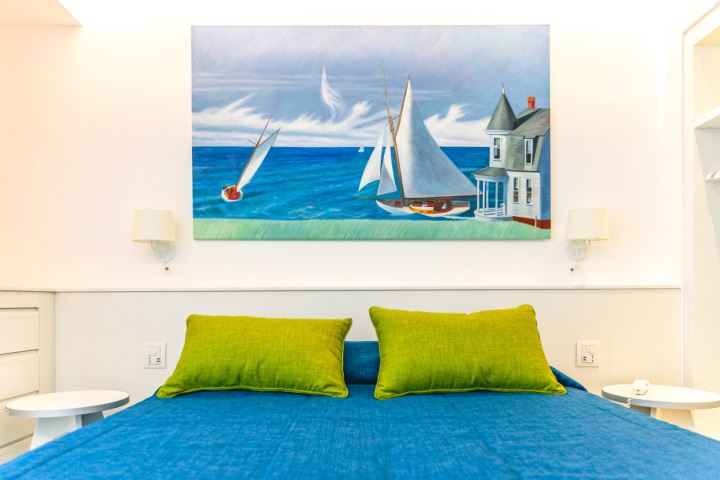 Camera da letto 5: letto King size; doppia vista mare del balcone attrezzato e della finestra a sinistra del letto. La camera ha il bagno privato in camera con doccia e servizi.