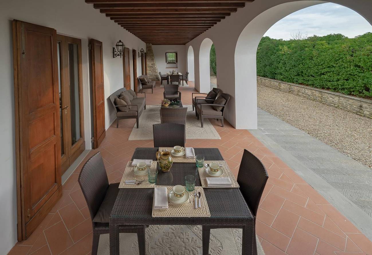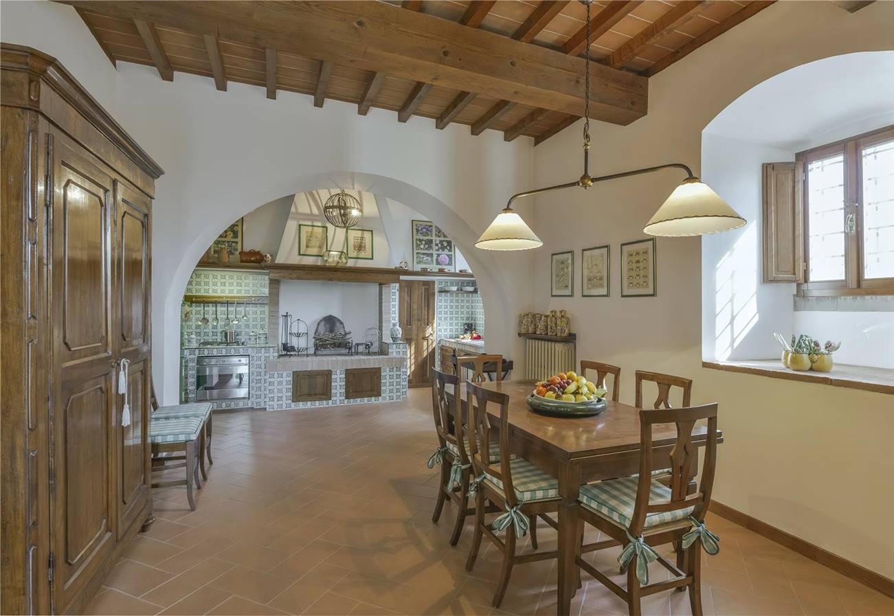 Piano terra della Villa: Un grande ingresso dà accesso alla zona giorno della Villa; le portefinestre si aprono su una bella loggia arredata con tavolo e sedie, divani e poltrone. Un soggiorno con camino e un'elegante sala da pranzo. Una grande cucina tradizionale in stile toscano, completamente attrezzata, il bagno degli ospiti.